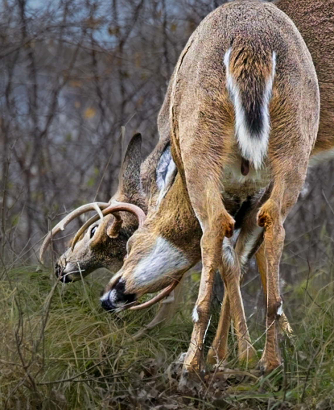 To bring us into the action, I cropped. I selected subject and added contrast, texture and clarity in Lightroom. I then selected the inverse and decreased exposure, texture and clarity on the grass/trees, so we aren't looking at all the busy grasses and trees. I used the radial gradient to add contrast to the eye. I brushed the back legs to decrease exposure and hopefully take our eye to the fight. Of course, we are looking at a deer's butt, which is not ideal. Hopefully, my quick re-work will give you some ideas on what might be possible with a different crop and focus.