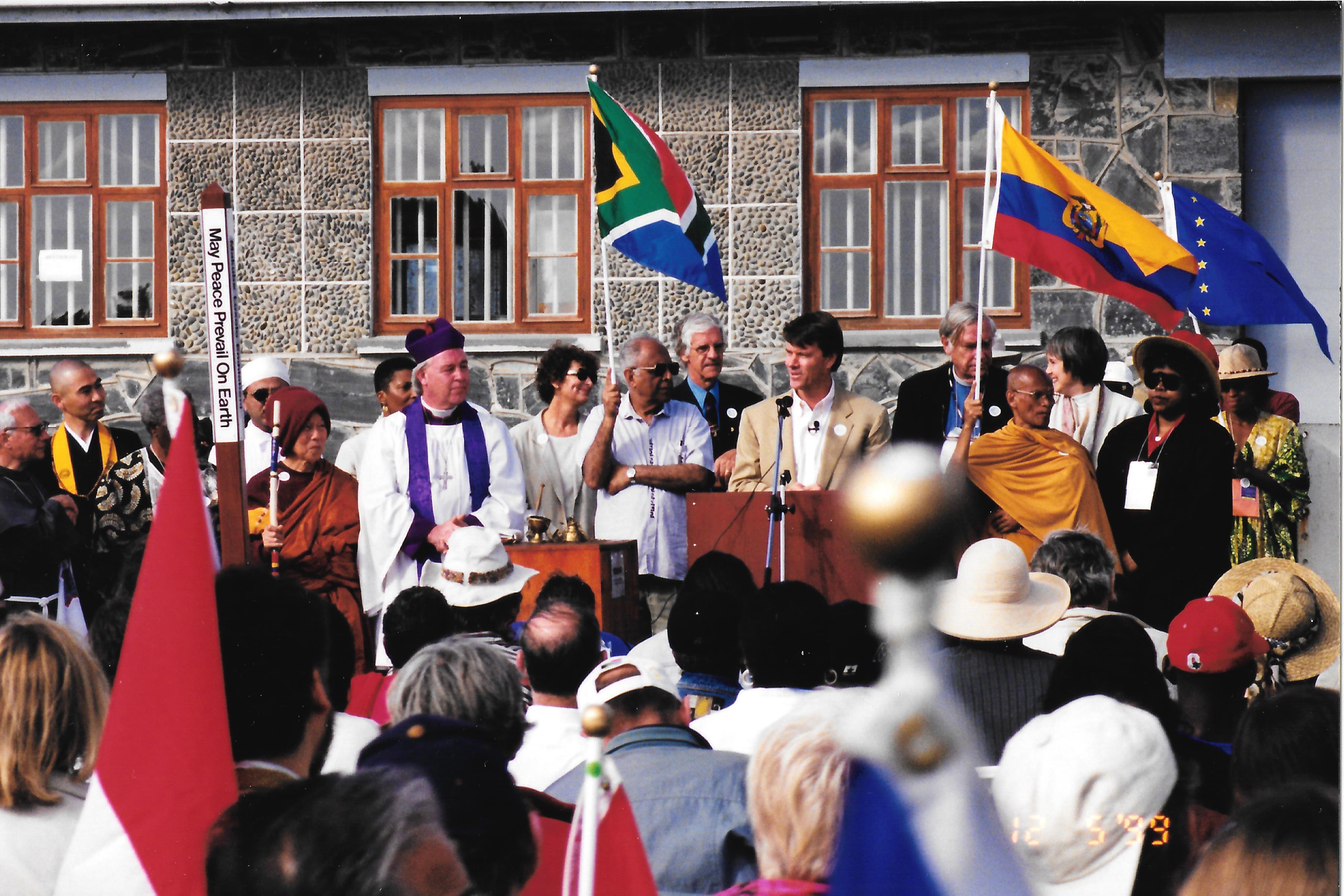 I met Nelson Mandela and heard him speak at the Parliament of World Religions in South Africa in 1999. I was with the group that planted the Peace Pole at Robben Island with Bishop Tutu (with hat on) and Nelson Mandela's right hand man, Ahmed Kathrada (holding South African flag). The speaker is Reverend John Morton, of the Institute for Individual and World Peace. |