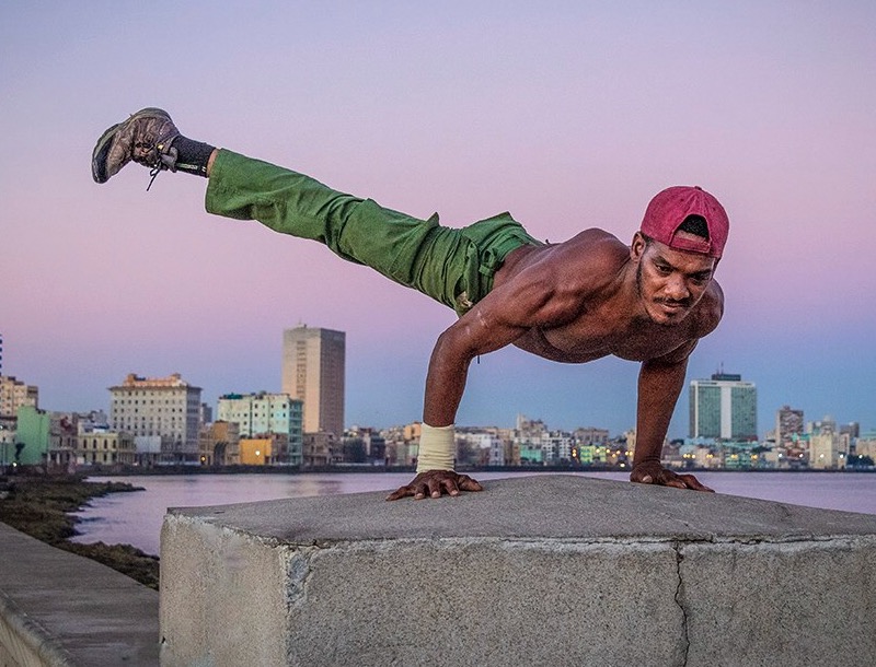I see leading lines from bottom left to the portion of the city framed by his arms. My eye seems to then fall to the bottom right and circle up and down the crack in the wall, then back up to the pleasing city backdrop. I too am including a cropped version which, I believe brings us in closer to the gymnast and his comfortably satisfied expression. I love this photo and thanks for sharing.