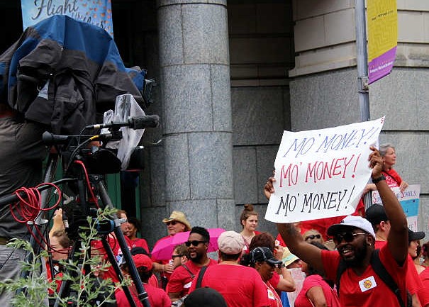 Teachers, who cant spell, on strike wearing red (blood) shirts. You found an opportunity to catch an emotionally impactful image that tells the story. I cropped out the women in the upper left for your consideration. |