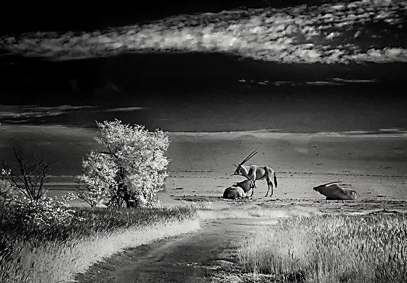 Well seen! Also nice to see an IR from Africa...and am guessing it is rarely done. Glad you worked the scenes with both color and IR. I played with this quite a bit, trying to reduce the 'crunchiness' of the noise patterns, get the animals out of dead center, and boost the contrast on the whole scene. I also did a mask to allow me to set a white point in Levels in the clouds. For what it's worth, here's the adjusted version I made. See what you think. |