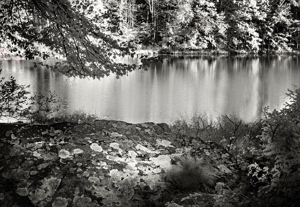 What a tranquil view! IR has enhanced this image in my opinion. What I'm missing is contrast and a white point in the foreground lichen, so I masked the bottom third, adjusted Levels here to get a true white, added contrast to the lower third, then darkened the corners all around with Nik Darken/Lighten Center in Color Efex Pro. See if you find this version to have greater visual impact. |