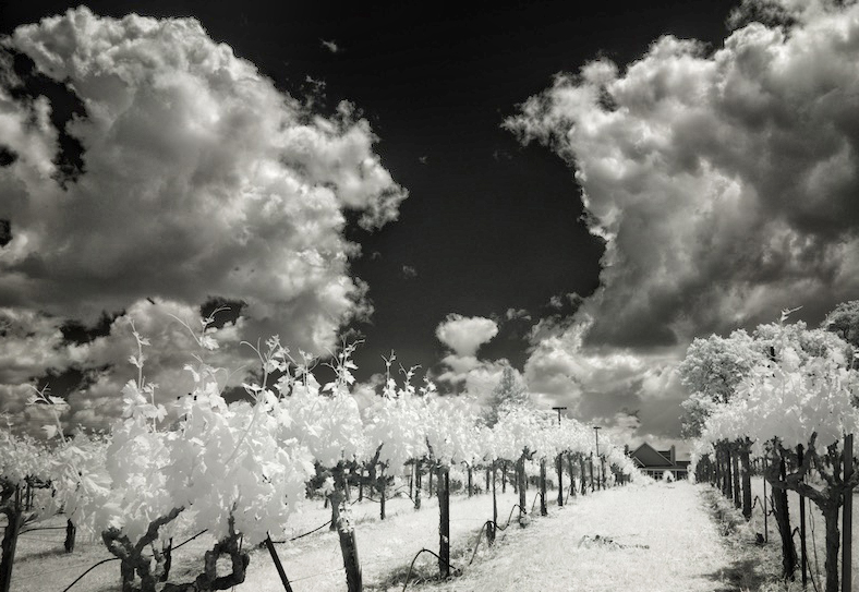 I really like the concept here, and IR serves you well. I'm not sure, however, if this is an image about the vines, the clouds, or both. I think it's the latter, and if so, I have masked the clouds and applied Detail Extractor to them and masked the vines so set a strong White point in Levels. I also lighted the grasses between the rows. You have many tones to deal with here, and you have many options. This is just one person's view of the scene. |