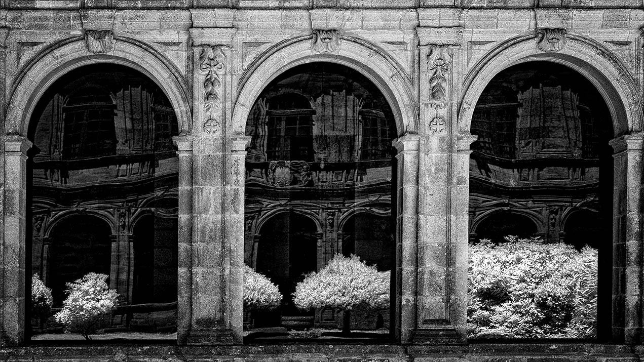 This is one of the strongest images I've seen of yours, and I feel it's got all the ingredients of a very strong IR image. The one thing I believe is essential is to get the foliage much, much more white. I used the Lasso tool to select each clump of the bushes one by one, feathered the edges of my selection, and then used the eye dropper too in Levels to click with the white dropper on the lightest piece of foliage I could find. Look at the difference when the living materials come to life with a bright white. |