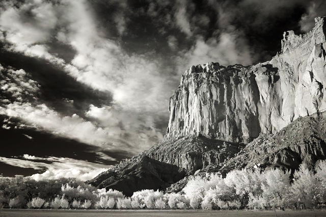 Stunning, Jack...what a wonderful scene with the IR medium. I know what you mean about the red rock, but monochrome sure does work in my view. Remember than Ansel used monochrome throughout the Southwest, and I think he did ok with the results! For my eye, the whole scene needs a little 'punch', but you know I like strong blacks and whites and contrast...more so than you generally prefer. So, just for fun, I adjusted Levels in the original, then masked the trees and used the 'white' eyedropper to put pure white into the brightest part of the foreground trees. I will admit, there's a slight, smallish 'spike' in the histogram, but it's not bothering me. |