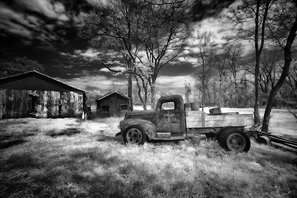I really like this for the story it tells and the treatment in IR. The shadows created by the sun coming through the trees makes a very interesting dappling on the white grasses. About the bright shed and competition with the truck...I applied NIK Darken/Lighten Center and got the attached option. I also used Viveza to lighten the rear tires of the truck. See what you think. It's a strong image in my mind. |