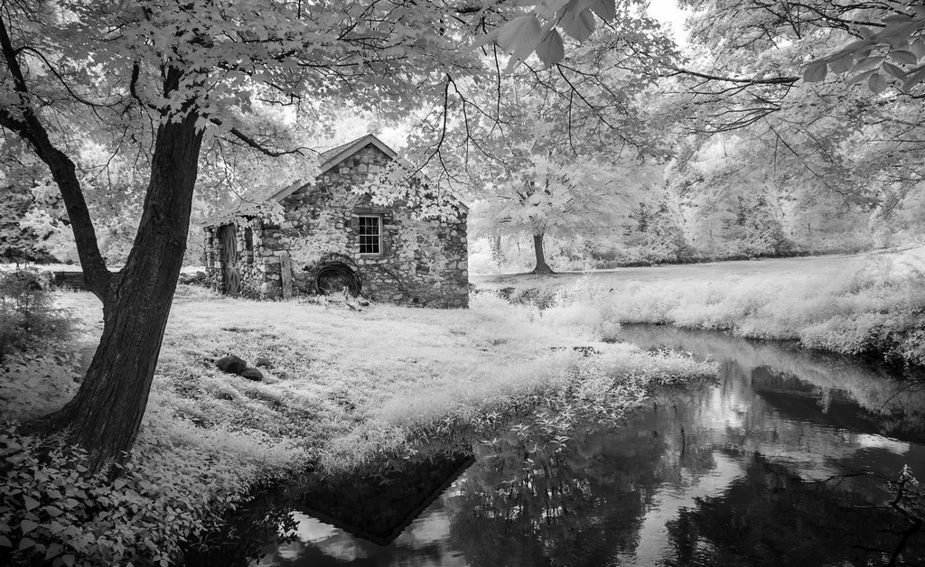 Again, a warm welcome to our merry band of IR photographers! Frequently, we submit 'our' version of your image with things we feel will make it display with greater impact. That's what I've done with the attached. I was slightly bothered by the other building (rh side), so it was removed with a (quick and dirty/crude) Content-Aware Fill and some cloning. I then used NIK Darken/Lighten Center for emphasis of the beautiful building, cropped just a smidge from the bottom and gave a mild burn to the creek side grasses. See what you think. By the way, as Jack and perhaps others will tell you, I am taken by bold blacks and whites and contrast...which may not be everyone's preference. |