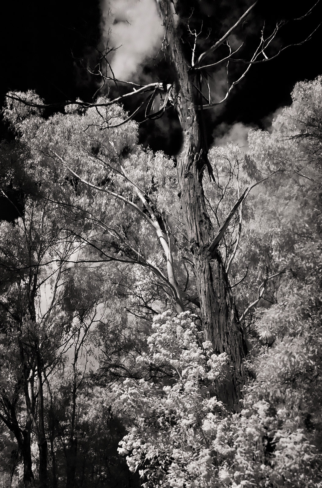 A most interesting subject well spotted by you! I wonder about the top portion of the tree, void of bark. The highlight of it takes my eye there first. I tried cloning (VERY crudely) in bark in the adj version attached. See what you think. Also, this looks a bit soft to me, so I applied Filter>Sharpen>Smart Sharpen>Lens Blur to give it some 'snap'...hopefully didn't go overboard. Again, have a look and let me know your thoughts. You've used IR very well in composing this one! |