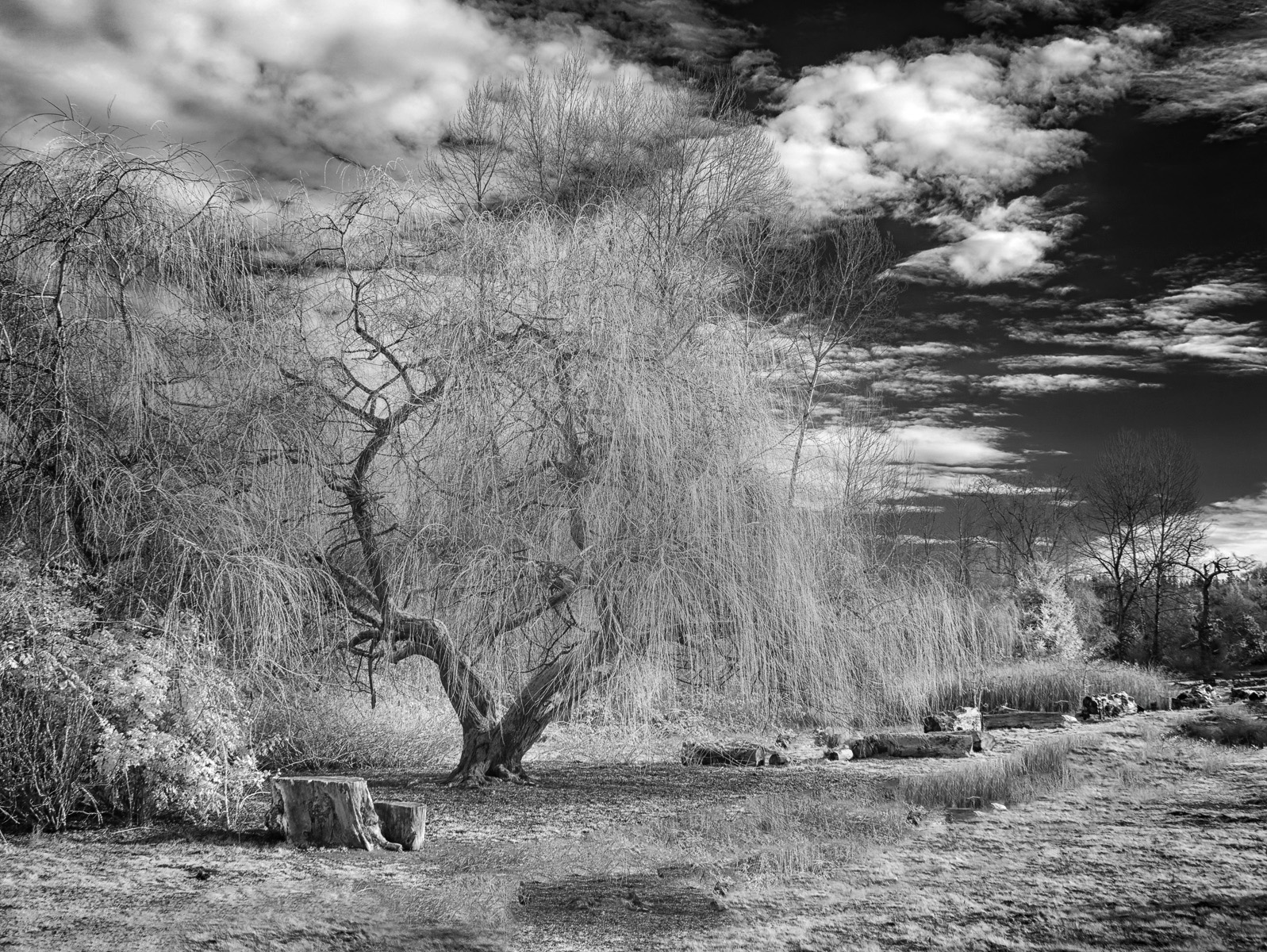 Well seen! I wish we had more weeping willows in our area, as they are wonderful subjects for IR. I was somewhat confused with the blending of the willow into the sky/clouds behind, so I tried masking and darkening the willow a bit, darkening the corners, and finally removing the walkway/path with Content Aware Fill. It's simply one more view...what do you think of it? |