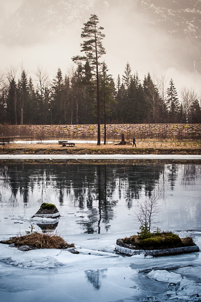 I would like to PP the pic in the way it shows the feel of the cold blue water in the foreground and the warm forest/tree in the background. The pic shows the contrast of the weather. attached my version. Hope you like it.