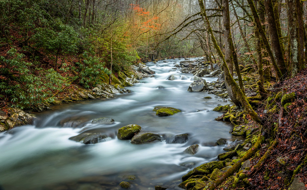 Michael, I really liked you composition of this shot. However, it is rather flat. I have adjusted your photo: decreased the brightness and increased the contact. Used levels and curves to bring out water and trees. I used select color red to bring out the color of the orange tree in the middle of the photo to draw the viewers eye up the stream to the plant. |