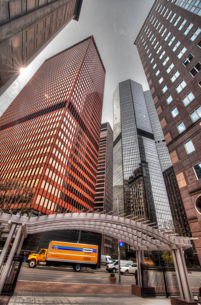 Nice composition, I enjoyed the star effect against the building. Only change I would suggest is to remove the sign in front bottom. It is a distraction. Really liked the way you got the moving truck in the arch. Nice work. |