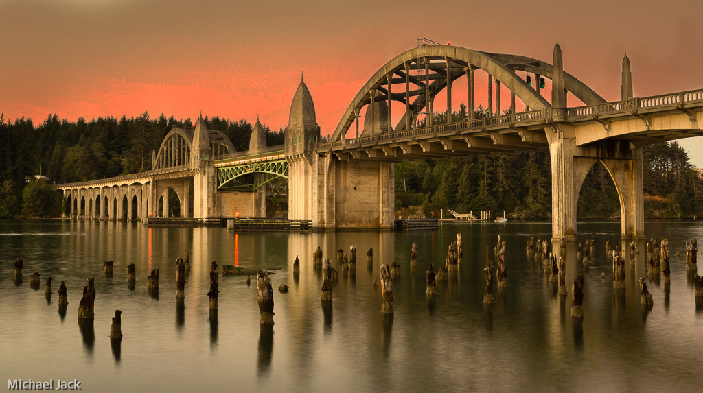 Very nice photo of the bridge. However, I find it somewhat flat. I might have lighten up the lightest the wooden piers to draw the viewers eye into the photo toward the bridge. I found your sky a little weak. In darking up the sky I found you had some nice sunrise sky. I adjusted your photo to bring out the sky. Hope you don't mind my working on your photo. |