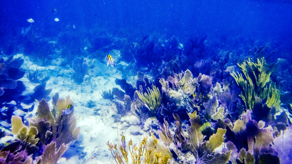 That is so fun! The colors are nice. All the different plants give lots of texture in the shot. Cropping to just above that center fish also brings out the landscape.