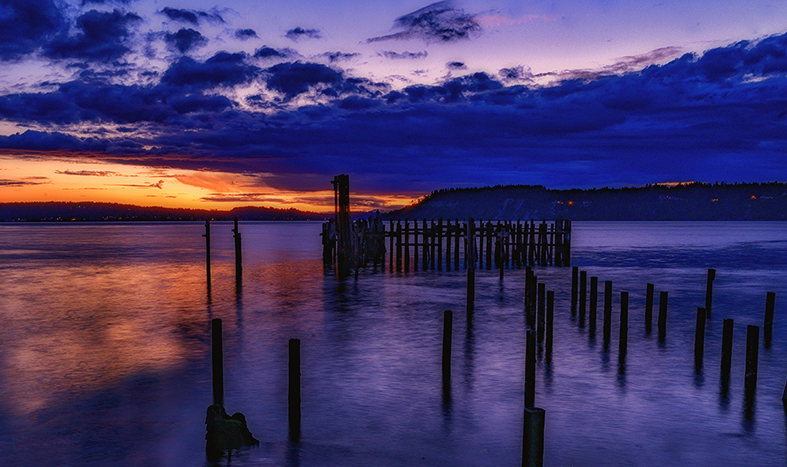 Very beautiful shot! The colors are wonderful. I like all the pylons. Your water looks nicely smooth. I have the same feelings about the deck on the left. Replacing it with more dimly glowing water would be nice. It would open up the water more.