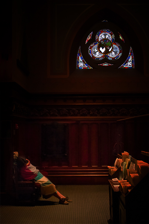 Your image does tell a heartfelt story of solace for the homeless and adds impact especially with the colorful window and blanket. I too think the red exit sign removal would improve the image. You may want to open up the shadows on this woman too to bring more awareness of her head and shoulders since she is the center of interest. See my visual feedback image with a tighter vignette around her, the window and rack. |