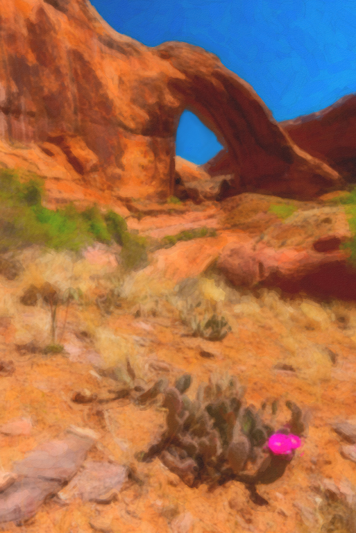 I enjoy your colors and composition. I like that you brought back some of the realistic appearance of the flower as that is such a key focus point. You may want to go around inside the arch with the mixer brush with settings of 50 50 50 which makes the brush act like a blender and blend in some of the strokes next to the inside of the arch. Those marks inside are often a give away that a filter was used. Doesn't seem to be a problem outside the arch. |
