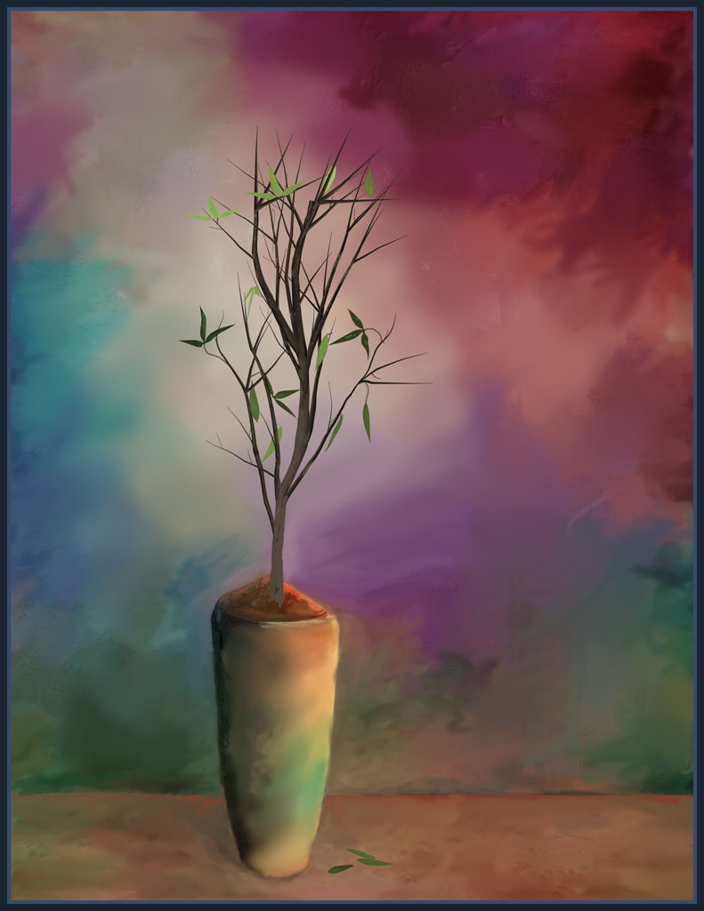 This is very attractive photo and yet very different and still attractive art piece. I like the 3 leaves you put at the base. We get our ideas in variety of ways and I like the way you gleaned the lines that you found attractive in the photo to create this new piece. I suggest you look at about 300% around the vase especially on the left side between the background and the next to the vase. there are corrections you can make with the healing brush or the mixed brush used as a blender with settings of wet load mix and flow at 50 . I find the colors you used in the background very attractive and in harmony to the vase. |