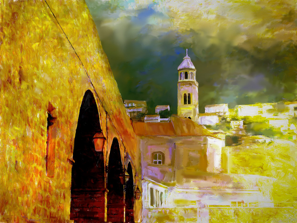 Your warmer colors really make it pop, Kathy. You may want to take it in to lower the shadows some more on the buildings, but I like the way you brought back the detail of the white building. The clouds are spectacular. The painting makes this image come to life. |