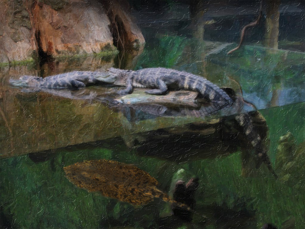 In my visual review I did a move of the sting ray to connect it more with the scene and used the burn tool to reduce its brightness as i did with the snake to keep the emphasis on your subject of the "Gators" Your painting really adds to the image. I enjoy this texture of Impasto Enjoyed talking with you yesterday and look forward to having more time to talk.