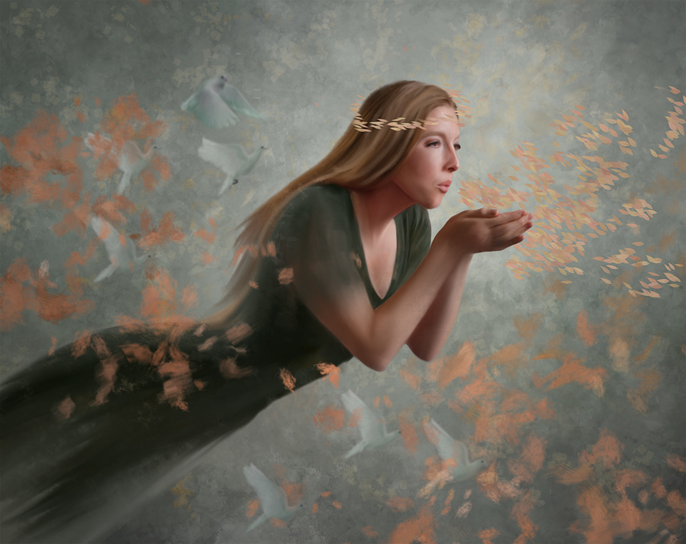 Edge: On the sleeve of the hand with the fan you have one sharp flesh tone brush stroke. I love the addition of the color, but you may want to soften the edges just a bit so their sharpness doesn't draw the eye to it.