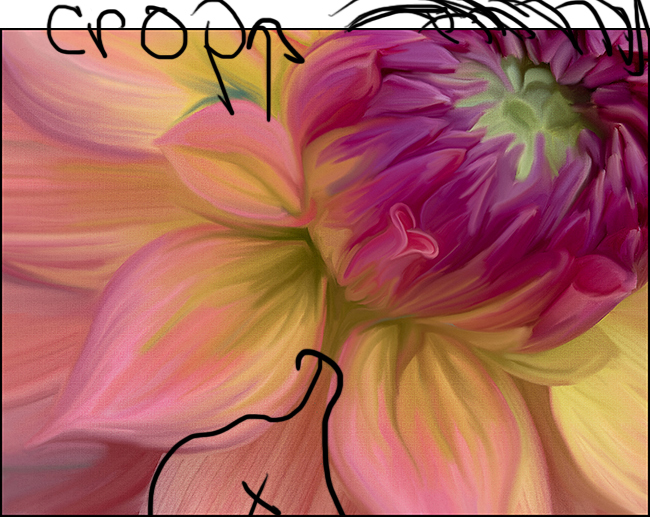 I will now look for the heart in Dahlias. I never realized that was possible. Just lovely colors and attractive image. My eye enjoys the less saturated colors. I agree with Terry on the suggestion to paint the right petal next to the edge. I also suggest adding some of the painting texture to the petal right below the center and maybe similar to the ones on the left. To my eye the one just below the center doesn't look as painted and draws my eye to it. You may also wish to extend the crop a bit on the upper left to give a bit more of the upper petals on the center. My eye wants to see just a bit more. See visual feedback |