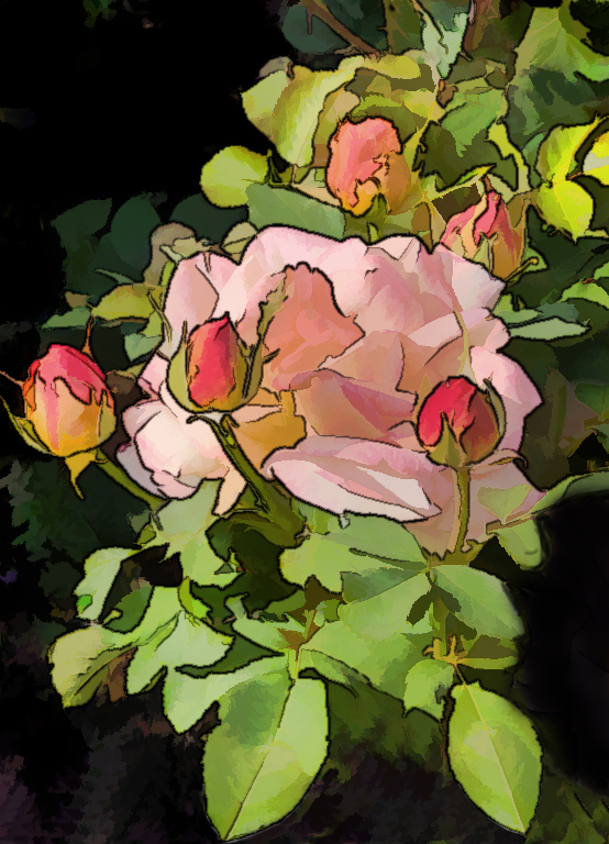I enjoy your composition of the slight diagonal of the center rose and surrounding buds. Your colors and technique add to this image and says Modern Spring. Your choice to remove the distraction of leaves on the left was a good one. To my eye the right light pink rose grabbed my attention so in my visual feedback, I removed it. Just an idea. |