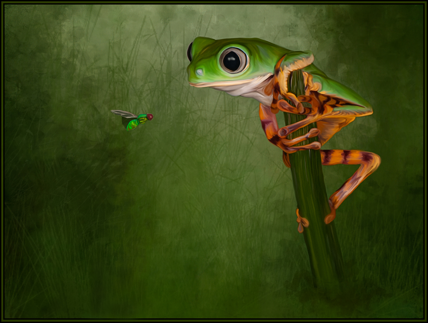 Cindy, I love this. Your title is so clever. That is the hardest task for me. Your use of the grass brush and background really enhance this image. YOur paint strokes are nicely done too with good shading and multiple colors. Your fly is fabulous. I am impressed you drew this and it really adds to the storytelling. Just as an idea, I moved the fly a bit closer, as it seemed to my eye the distance was too great. |