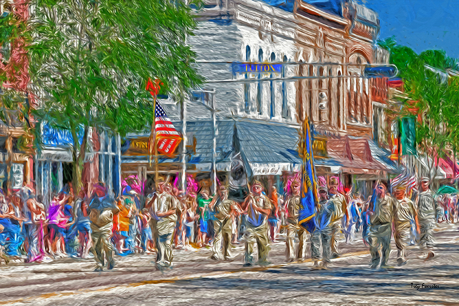 Your image has a familiar and warm feeling of a small-town holiday and really says America. The painting technique you used adds to the impact of the image with its bright colors and your choice to bring back the stars on the American flag, was a good choice. To my eye the sky is a bit of a distraction with the halo effect along the top trees. I took the healing brush and removed them. |