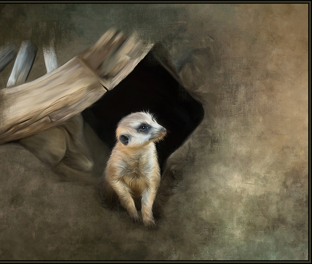Wow, you always come up with the best artwork concepts. Love the warm tones and hues in this image and the unique brush strokes on the wagon wheel and rocks. The fur on the Meerkat is perfect and the eye is so sharp. Beautiful work. I would crop to take the meerkat out of the center. |