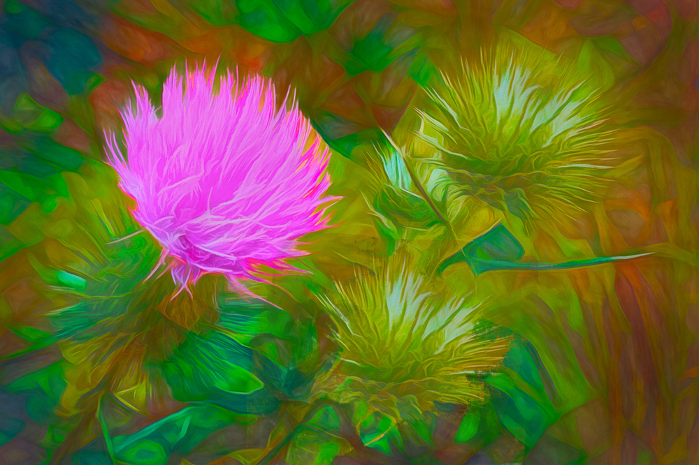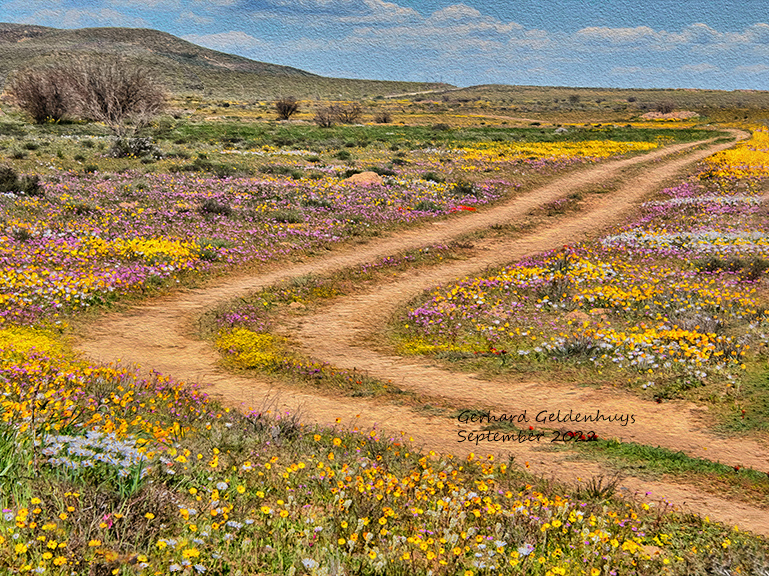 The road adds so much to the image and while not a clear visible s-curve road, it is indeed one. I cropped on the left and added on the right enhancing the road at the upper right and on the left, and moved two key plant pieces to the right. |