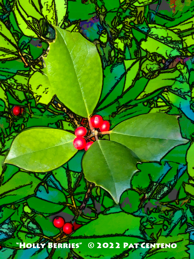 Hi Pat, Love the Christmas theme and the beauty of the complementary colors of the seasonal red and green are always attractive. The composition of your leaves is nicely done. I agree with Cindy on the notched areas of the center leaf and used the spot healing brush to correct this missing area. |