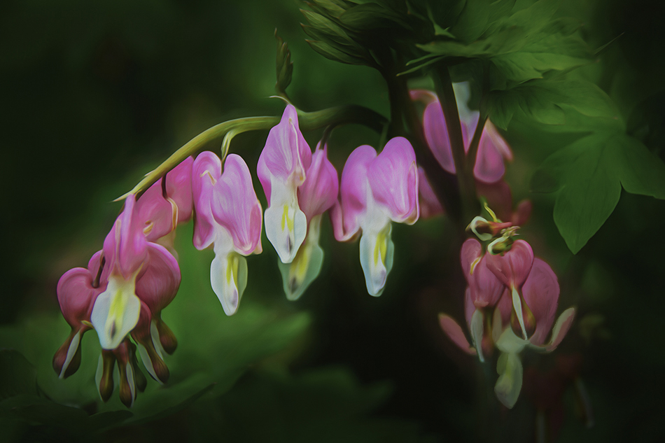 I feel your choice to use the complementary colors in the image of Red and Green supports the attraction my eye enjoys. I find the blending of the background leaves really makes the blossoms stand out and eliminates the distraction of the fine details in the leaves. However, the one sharp leaf in the upper right I feel really acts like a wonderful leading line.