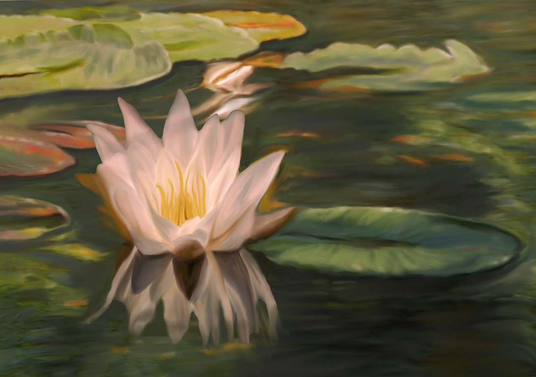 I love the color harmony and the way the leaves at the top tend to frame the lily. Your painted is excellent. There is another idea, just make a selection of the lily and make it bigger and keep all that beautiful surrounding vegetation. This is a very rough visual feedback and just an idea. You may want to darken the upper left leaf too to keep the interest on the lily. |