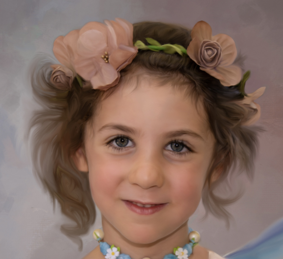 What a beautiful painting . The face features are outstanding and the color harmony so charming. I agree on the hair in your final without the wings but, go back to your one with the wings. Here the hair looks perfect. It is more in keeping with her small face and is not so thick around the sides and more wispy. Love the background and the use of the brayer to give it the artistic look. |