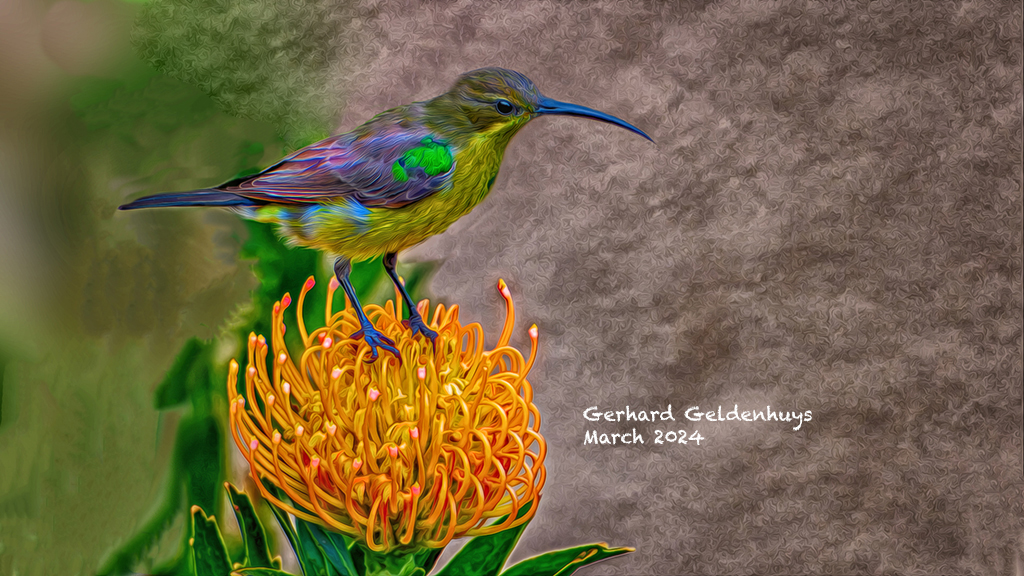 What a lovely bird on one of my favorite flowers. Great Capture and your technique really added the spark to make it an art piece. I love the contrast and texture of the brown background and suggest you might want to work on the halo under the bird breast with brushes and blur in the green to break up the digital look with the green and its sharp edge. just an idea with my visual feedback