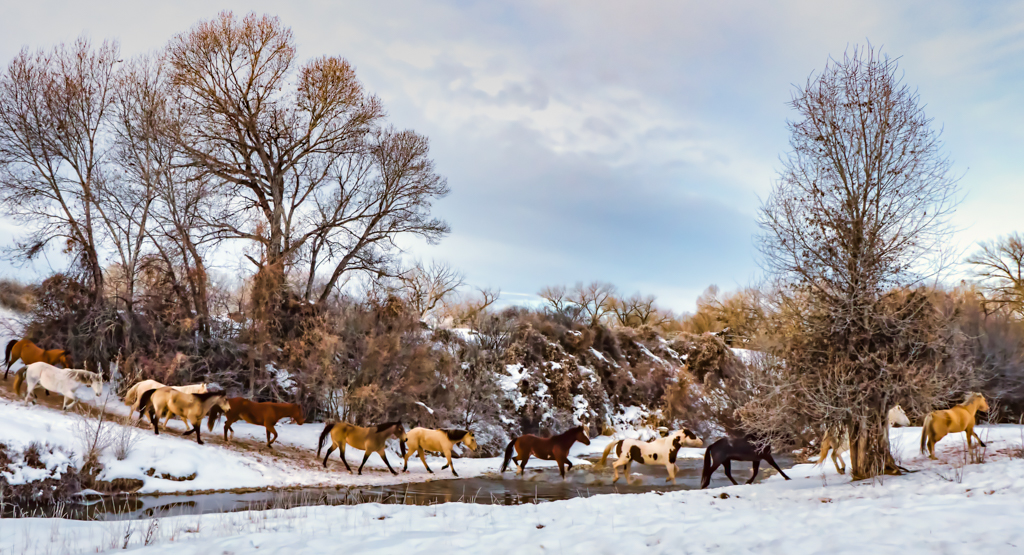 I tried the cropping suggestions and also cloned out the fence at the upper left. I like it a lot better. But I will be starting over from scratch on this image because I see I have lost too much detail in the horses - probably from overdoing denoise. Thanks for the suggestions! |