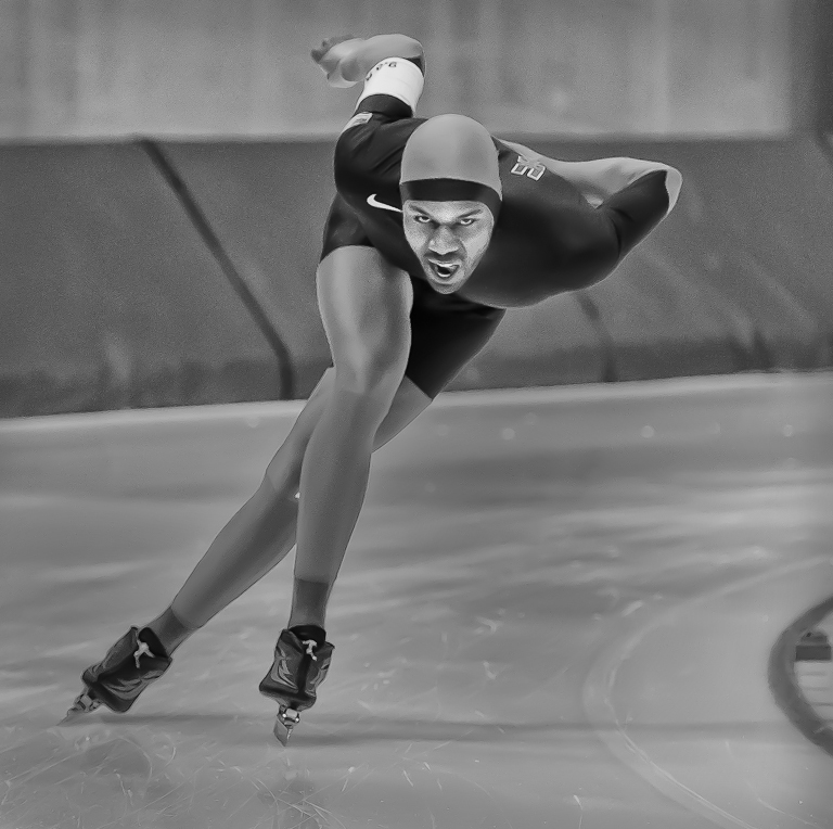 This is a fine action shot and you have done well to keep the skater in focus with an aperture of f2.8. I have played with the mono image to make the skaters face lighter and the background darker but I much prefer the colour version-the blue and red make the skater stand out- compared to your version or mine.
