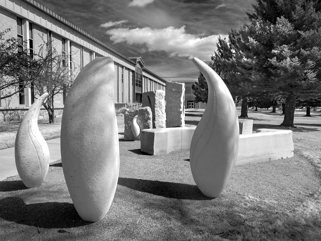 A good lead in line with the building on the left and the trees on the right brings our attention to the sculptures in the centre. The sky adds to the picture. I would lighten it slightly to bring out the shadow detail in the trees. I like it in mono. |