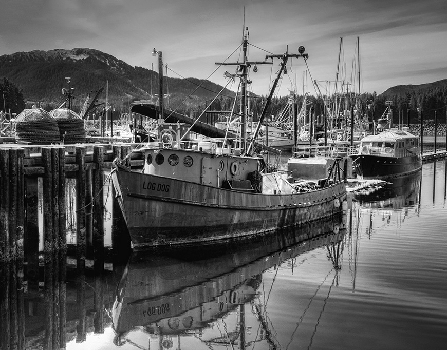 As you say the picture is about lines and reflections. My eye tends to look at the first boat with its wonderful reflection. You might consider cropping out the 3rd boat, although this is a matter of taste. I have also cloned out the small white cloud and the sky on the upper left although again these are a matter of taste |