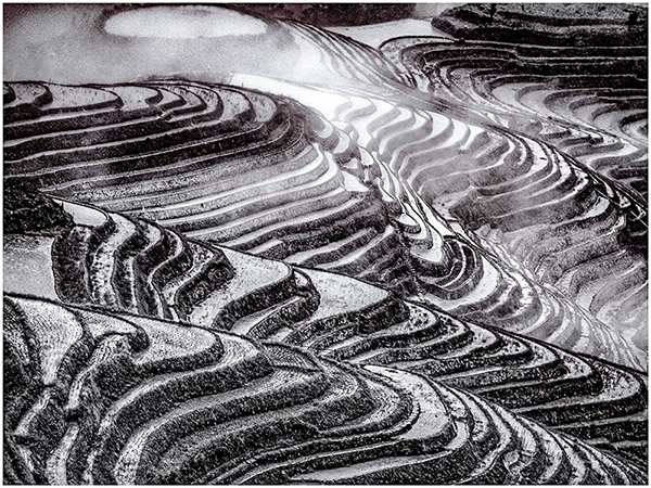 To me this could be a picture of the rice fields and moodiness of the clouds. In which case a colour version may be better. I would be interested to see the colour version. However, it could be a picture about the curves and lines, in which case I think the clouds detract from the image. If I wanted an image of the curves and lines I may try something like the attached. |