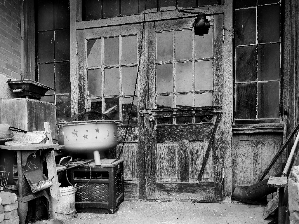 To me this image is about textures and is perfect for mono. I agree with Cindy's comments. However I think she has over done it with the contrast. I would go halfway between her image and yours. I find the light area in the right windows distracting and I would clone this out. |