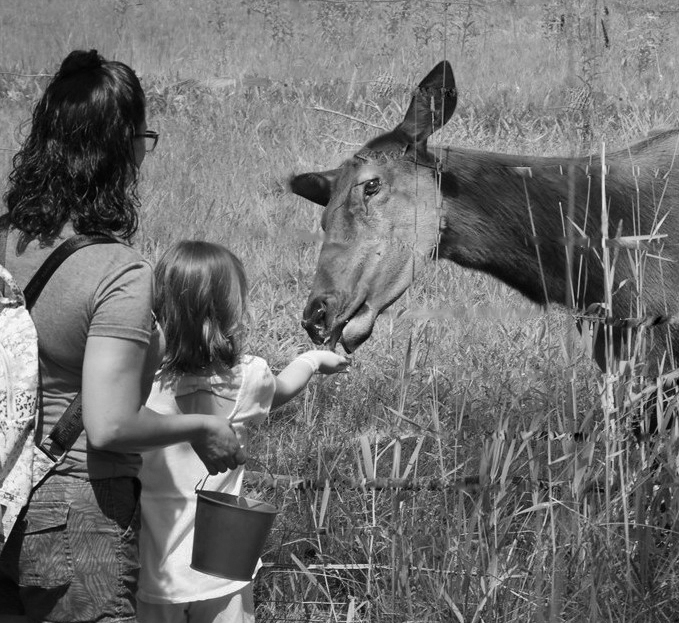 You have shown an interesting interaction between the girl and the deer. The principal elements in the picture, mother, girl and deer are all sharp. As you imply the most important part of the picture is the deer licking the corn in the girl's hand. I would make this a larger part of the picture by cropping the right hand side. However I would crop less than you have done to show all of the mother (not done in my version). Clone out any bits like the branch. I have adjusted the brightness and contrast in various parts of the image. Finally I have used the Spot Removal tool to clone out the fence. |