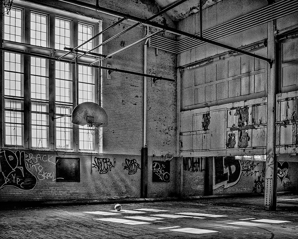 An interesting image which I could imagine me taking. I like the graffiti round the gym and the basket ball which I assume you have placed in the perfect position. As I cannot help myself playing around with images and so I took it into Topaz Adjust and used the Heavy pop grunge filter. |