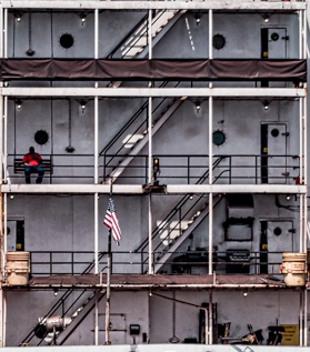 I agree with Cindy and would crop to stairs and man if you have enough pixels to play with. I would crop to give a frame on the outside of the picture. With this crop I think the mono just beats the colour. |