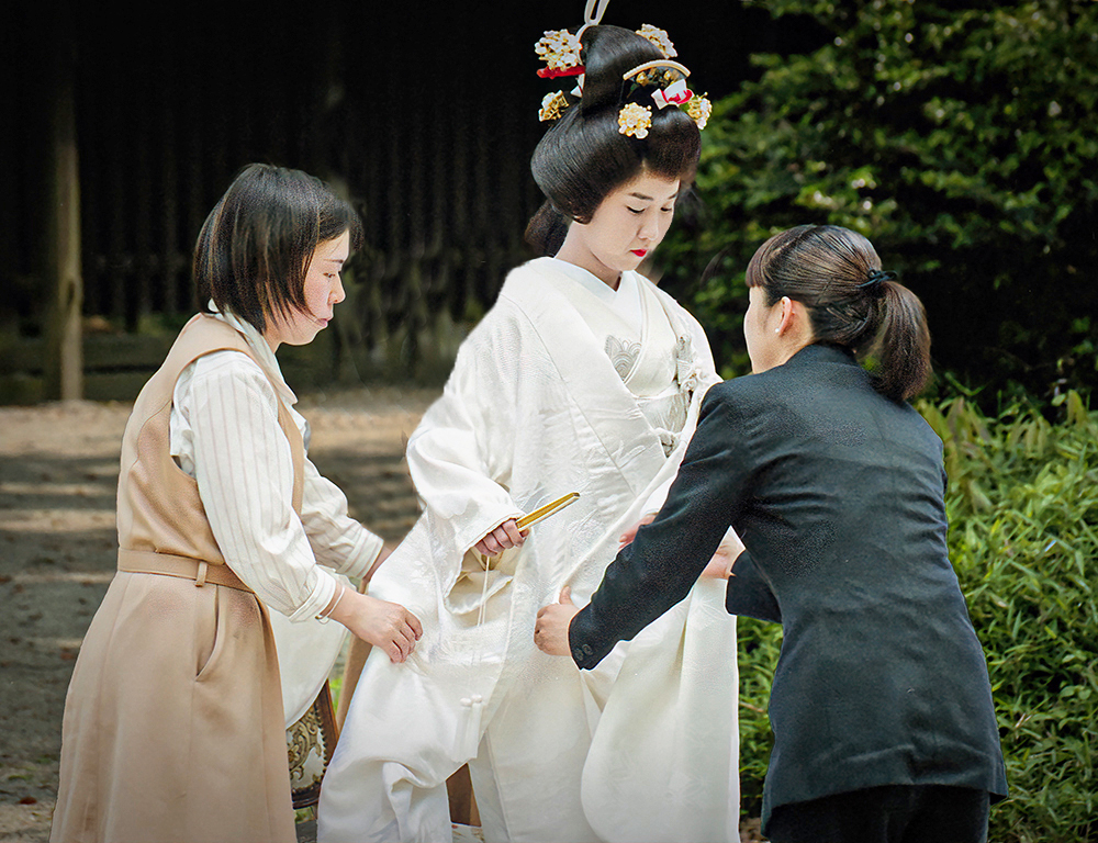 To my mind this image can be one of two things. It can be a record of a happy event during your time in Japan in which case I would increase the texture in camera raw to bring out the dress and perhaps increase the brightness. If you want it to be a pictorial image I would also clone out the person behind the bride. Either way a lovely image. |