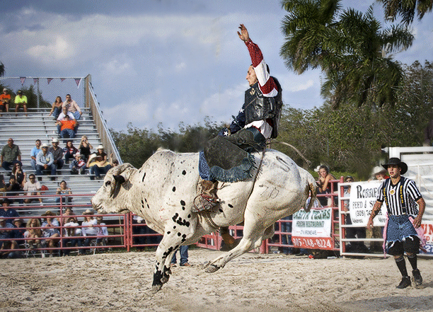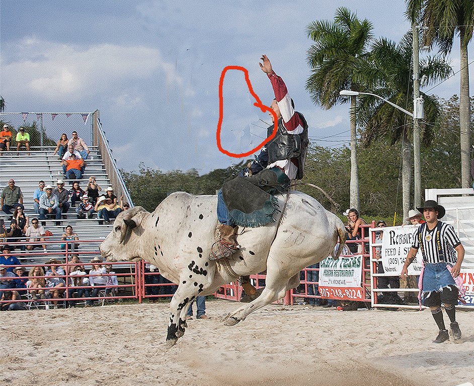 I would love to see one of these bull rodeos but we don't have them in the uk. I think you have cropped it perfectly and have made the correct decision to get rid of the wires and poles. However you haven't done a good job with this (see image). I don't know if you use the spot healing brush but I find this to be the best way to get rid of wires and poles. See