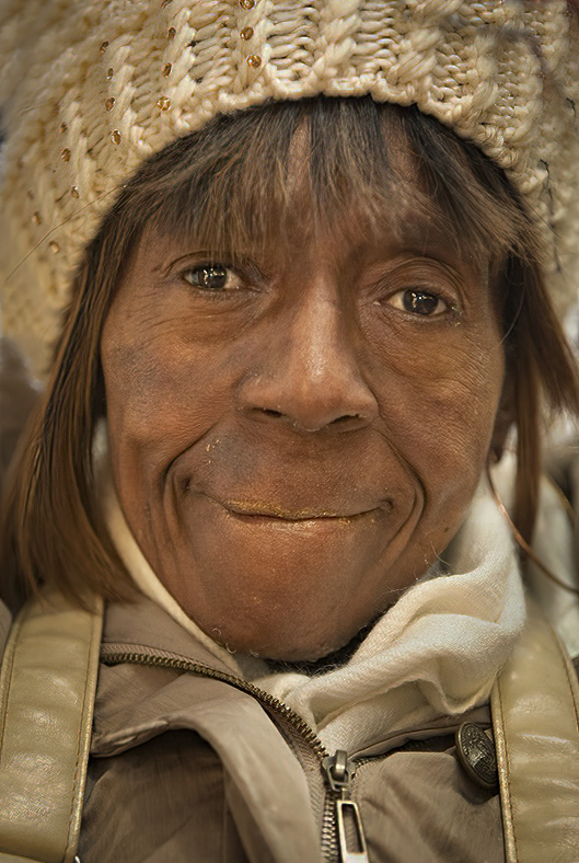 What is this photo about? You have said it is about the face and her eyes. I agree and she does make an interesting image. So let's us now look at the rest of the image. For me in all the versions the background is a distraction. I tried to fit her into a different background but I couldn't find anything I liked. I also don't like the part of the hat in the top right. You have shot at f/2.8 which gives a very narrow depth of field and her hair is out of focus and I think you have over processed to try to get things in focus.