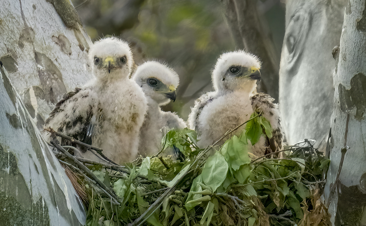 What started as a good image has got better and better as people have commented. I love the chick on the left looking straight at the camera and the sharpness of the chicks. Looking at the latest version I find the bright trunk a distraction and once I noticed it my eyes keep been drawn towards it. In the image below I have cropped the top slightly then used the spot healing brush to remove the "white circles" and finally on a colour layer painted the colour of the bark on the right branch. |