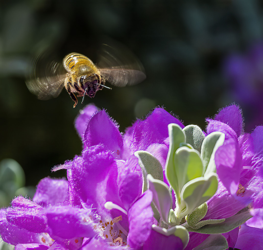 I must remember when shooting moving insects that 1/400 sec exposure will freeze the body but show movement on the wings which I really like. I agree with Jim about cropping but I think he has taken it too tight. I also think a slight sharpening around the bee and its surrounding petals help. You have shown two different images but I prefer the processed one over the "original". |
